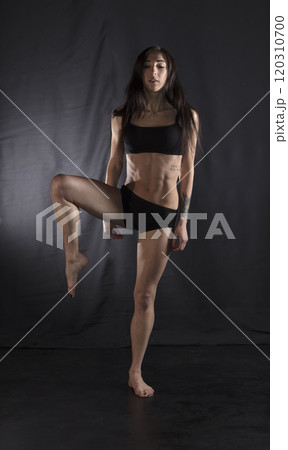 Girl lying and perform variety of exercises to strengthen muscles of press with wide resistance band