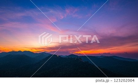 Aerial view of Majestic Buddha on the mountain at colorful sunset.