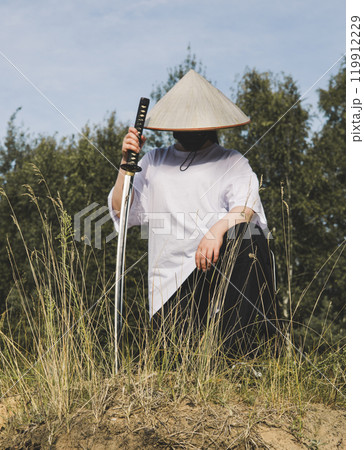 A warrior katana on the river bank. A man dressed as a samurai, with a conical hat and mask, kneels in nature holding a katana, creating a striking contrast between tradition and modernity.
