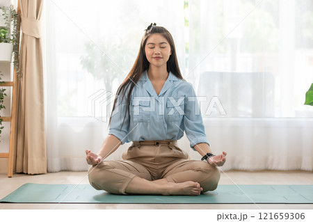 Asian young woman meditating in a calm home environment. Seated cross-legged on a yoga mat, she exudes tranquility and focus, representing themes of mindfulness, wellness, and inner peace