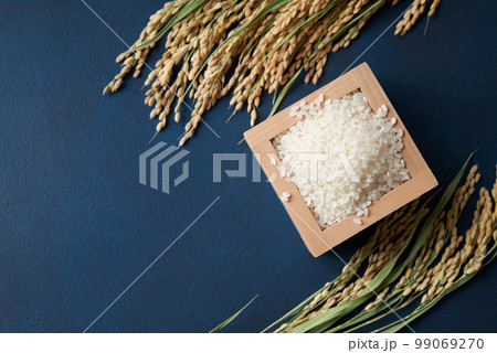 升に入ったお米 白米と稲穂 精米されたお米 イメージ素材