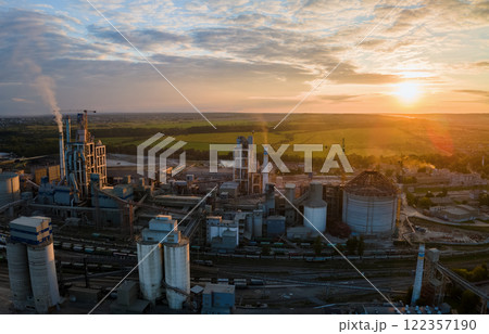 Aerial view of cement factory with high concrete plant structure and tower crane at industrial manufacturing site on foggy evening. Production and global industry concept.