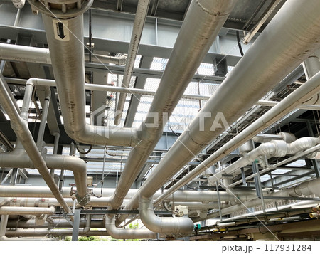 頭上に施設された設備配管 工場に張り巡らされた配管