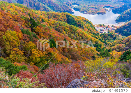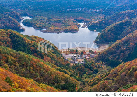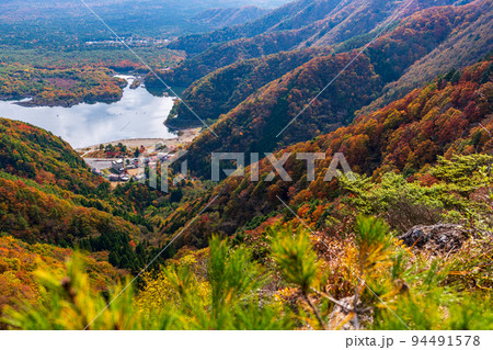 (山梨県)紅葉に染まる精進峠から見下ろす精進湖