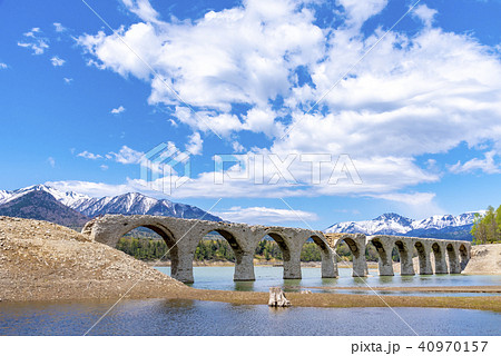 秋晴れの日の旧国鉄士幌線タウシュベツ川橋梁 北海道上士幌町