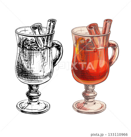 Mulled wine glass with ingredients. Vintage hatching vector illustration