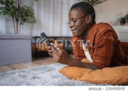 Two Young Adult Black Women Relaxing on Sofa, Drinking Tea and Chatting