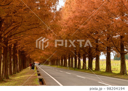 紅葉した滋賀県マキノ町のメタセコイア並木