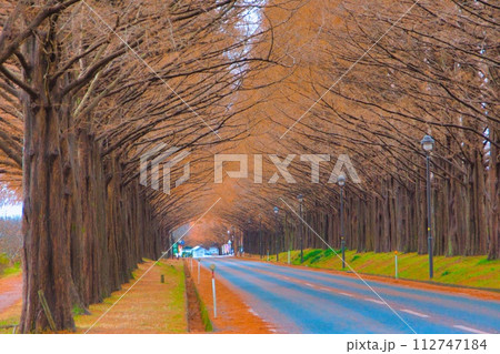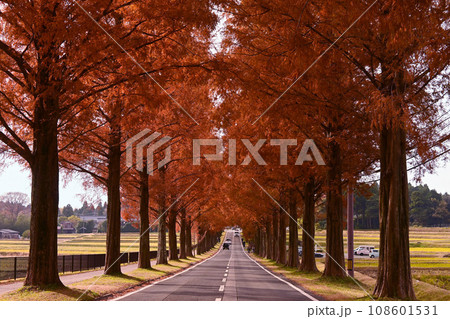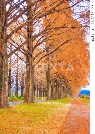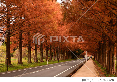 紅葉した滋賀県マキノ町のメタセコイア並木