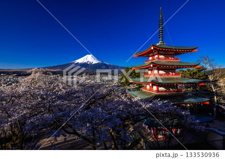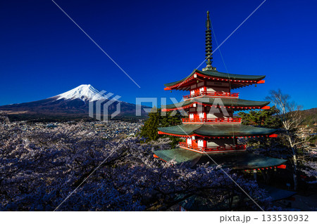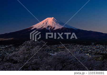【山梨県_富士吉田市】富士山の夜明けと桜満開の新倉山浅間公園 4月