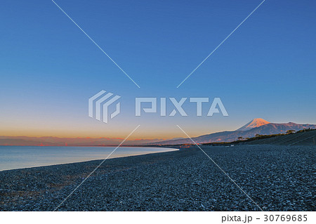 神奈川県 夜明けの湘南海岸と朝焼けの富士山