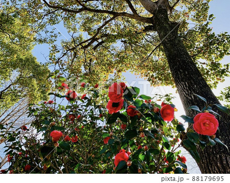 満開の紅椿を見上げる[岡崎城公園/愛知県岡崎市]
