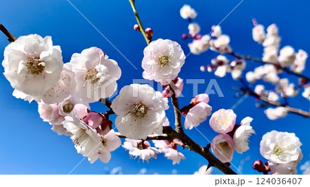 青空に映える満開の白梅(思いのまま)〈南公園「葵梅林」/愛知県岡崎市〉