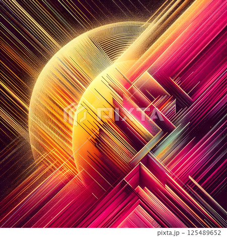 Dynamic abstract composition with glowing golden spheres and sharp magenta lines