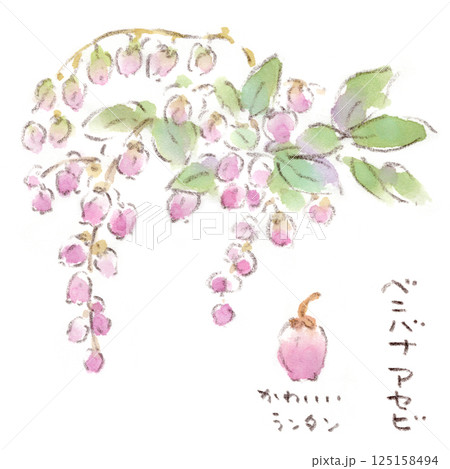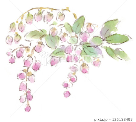 春の植物、鈴なりのピンクの可愛らしい小花、ベニバナアセビの水彩画イラスト