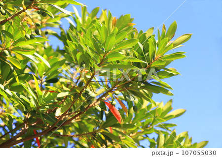 実をつけた一部紅葉したホルトの木