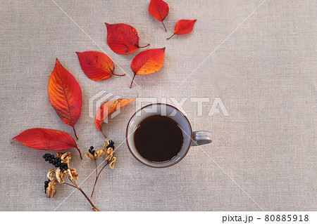 秋の背景 コーヒー 紅葉 松ぼっくり シナモンスティック