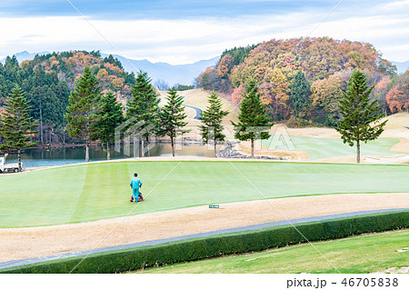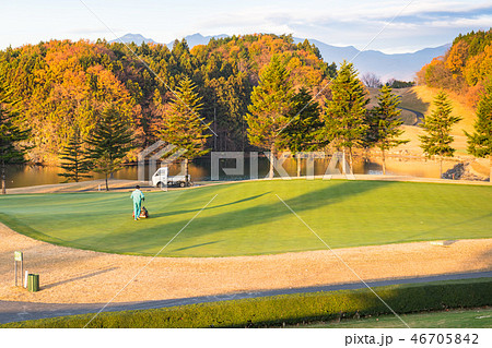 紅葉のゴルフ場で早朝に芝を刈るグリーンキーパー