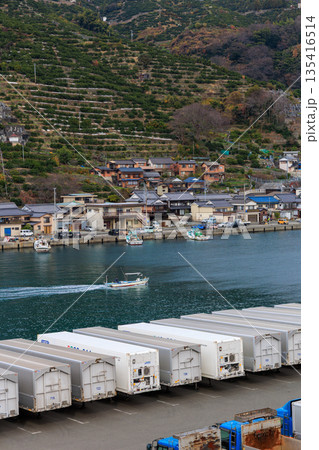愛媛県八幡浜港の物流風景 白コンテナトラック列と漁船走るモーターボート 港町集落紅葉山バックの海運漁