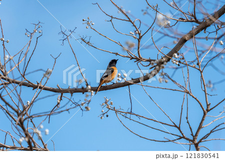 梅の枝にとまるツグミ科の渡り鳥ジョウビタキの雄