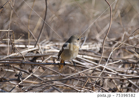 枯れ草にとまるメスのジョウビタキ