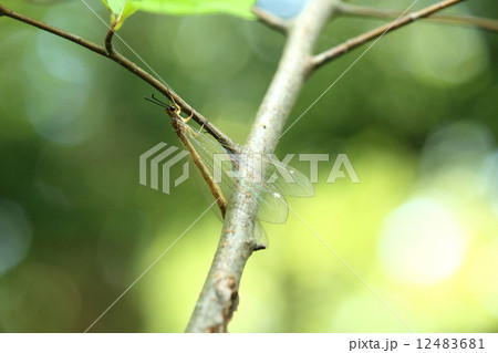 生き物 昆虫 ウスバカゲロウ、林の中をヒラヒラ飛んで明るい木の枝に止まりました。羽の虹色の反射がきれいです