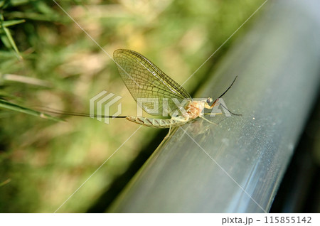 釣り竿に止ったフタスジモンカゲロウの幼虫