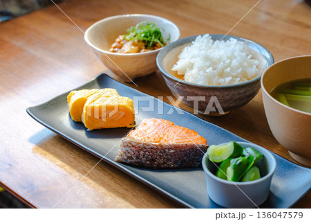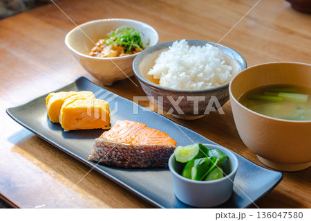朝日が差し込む木の食卓の和朝食定食(焼鮭・卵焼き・味噌汁・白米・小鉢)