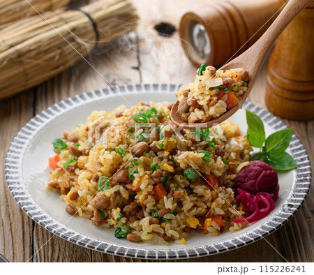 わら納豆を使った 納豆チャーハン ( 納豆の香ばしさが楽しめるアレンジ炒飯 )