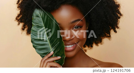 Smiling Young Woman Posing with Green Tropical Leaf