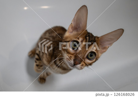 A cute kitten with captivating green eyes playfully explores the bathtub creating an adorable portrait of curiosity and charm in a homey setting. A beautiful kitten sits on the bottom of the bathtub.