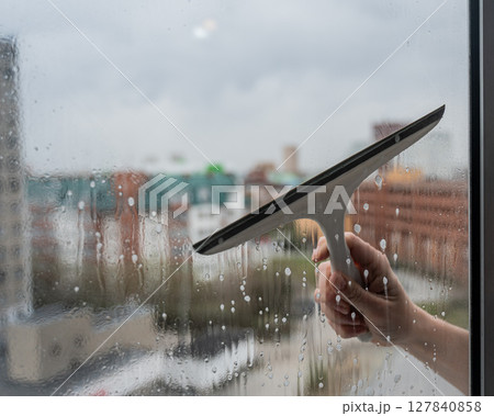 A woman washes a window with a scraper.
