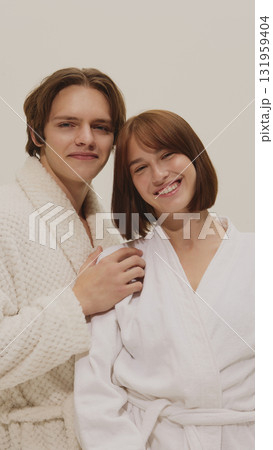 Smiling couple in cozy bathrobes showing healthy natural glow