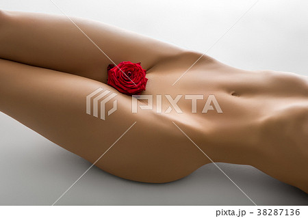 Caucasian woman in white panties with white rose flower on a uniform background, closeup
