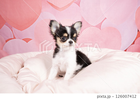 ピンクバックと白いベッドに入ったチワワの仔犬