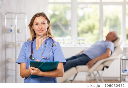 A doctor and a patient. The physician, wearing a white medical coat over a blue shirt, is filling out a medical record form during a consultation in the clinic. Medical service