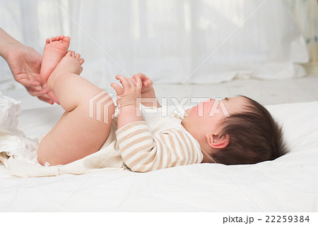 赤ちゃんの紙おむつを交換する母親 日本人女性