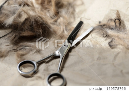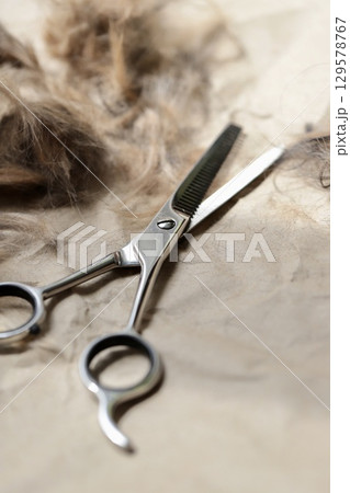 自宅でセルフカットした犬の毛とトリミング用スキバサミ
