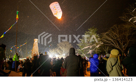 雪降る夜 願いを込めて 紙風船上げ 秋田県上桧木内