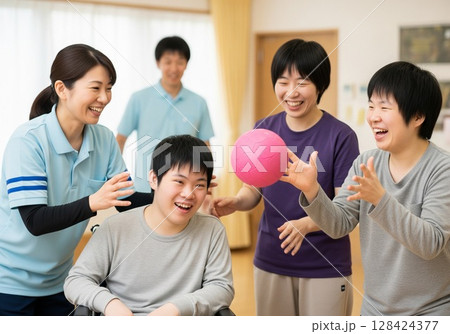 障がい者と支援員の笑顔のレクリエーション障がい者,障害者, ,運動,スポーツ,ゲーム,紙飛行機