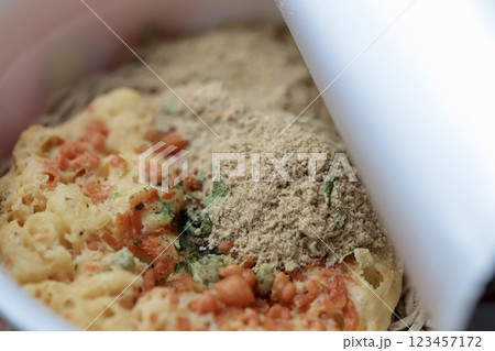 お湯を入れる前の天ぷら蕎麦のカップ麺 インスタント食品