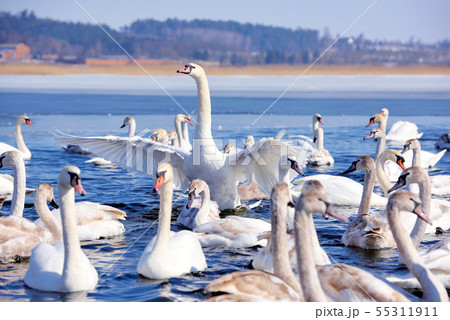 Beautiful swans (Cygnus olor) on blue lake