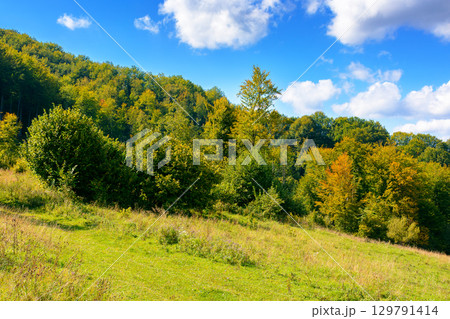 forest on the hill in rural area of carpathian mountains in autumn. wonderful scenery of volovets district. deciduous trees near grassy meadow in september