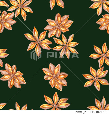 Star anise watercolor illustrations against a deep green background. Seamless pattern clipart. Ideal for textiles, seasonal wrapping paper, or culinary-themed packaging, for nature-inspired design