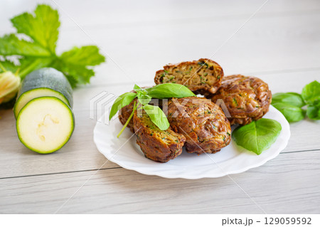 Zucchini muffins in a minimalist composition on a light wooden table