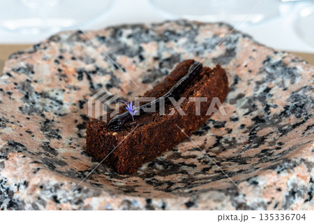 Gourmet chocolate dessert with a floral garnish served on a unique stone plate