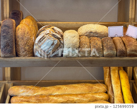 An assortment of freshly baked bread loaves is neatly displayed on wooden shelves in a bakery