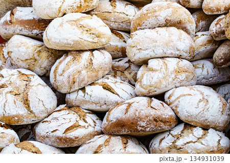 Many rustic fresh bread loaves