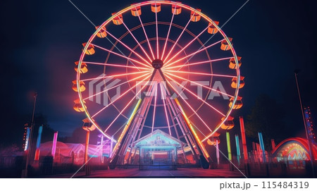 Colorful Ferris Wheel with Rainbow Lights in Dark Amusement Park at Night with bright colorful neon lights.