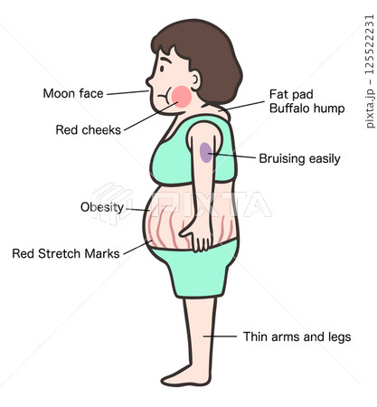 クッシング症候群の女性の側面、 特徴的な体型と症状
